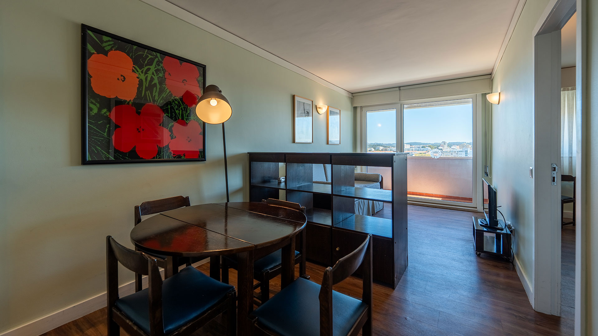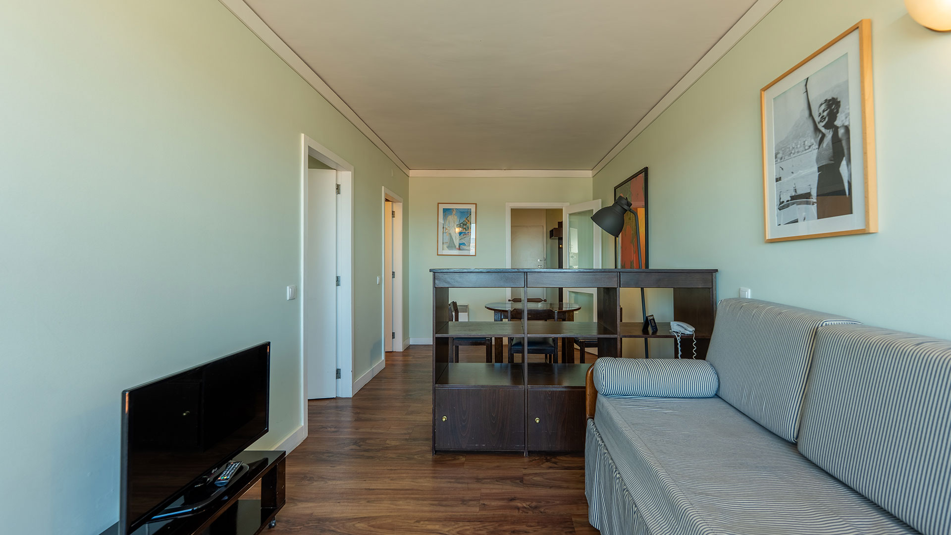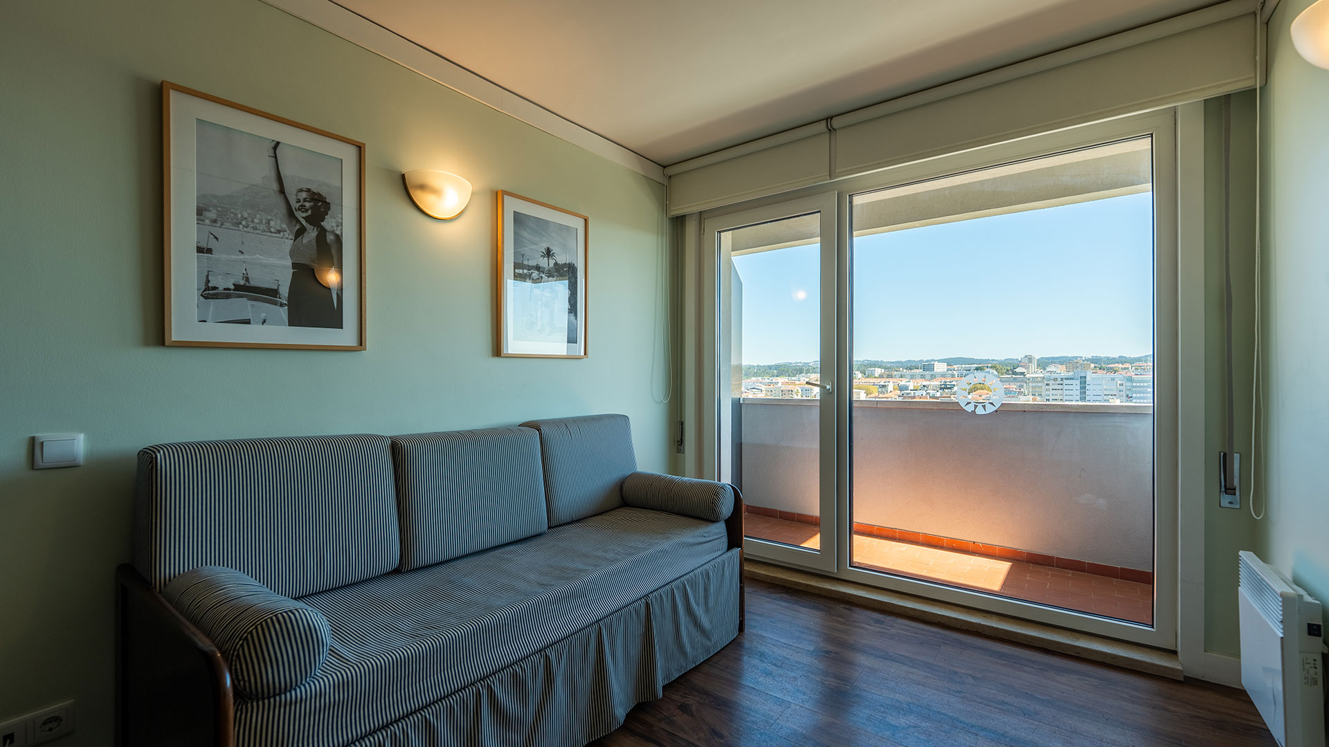 Zimmer mit zwei Einzelbetten, Badezimmer, eingerichtete Küche, Balkon und ein Wohnzimmer mit einem Bett oder zwei Betten zusätzlich.